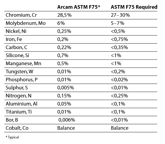 コバルト基合金は、工業化能够な製造工程として溶融鋳造を用いた過酷な分野で広く利用されてきた。Arcam社の電子ビーム溶融は鋳造技術と间接競争相手となり、コバルト基合金で複雑な部品を製造するためのもう一つの実行能够性の選択となる。コバルト基超合金鋳造の溶融鋳造の多くは開放的な大気雰囲気中で鋳造されているが、Arcam社の電子ビーム溶融プロセスは真空環境下で制御能够な環境を供给し、加工部品の资料机能をより優れたものにしている。コバルトクロムモリブデン合金は医療用インプラント装配に広く用いられ、特に高硬度または高研磨、極耐摩耗资料の合金に適している。膝関節インプラントなどのコバルトクロムモリブデン合金のアプリケーションの第一選択资料、金属対金属股関節および口腔修復中の部品。