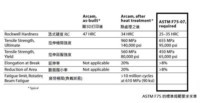 次の表2.Arcam ASTM F 75とASTM F 75の機械的卡能比較表